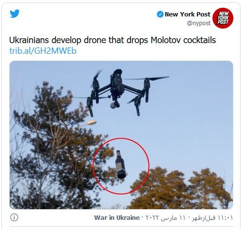 رادیو فردا:روزنامه نیویورک پست در گزارشی از همکاری واحدهای ذخیره ارتش اوکراین و کارخانه آبجوسازی «پراودا» برای طراحی و استفاده از پهپادهای مسلح به کوکتل مولوتف خبر داده است.از اولین روزهای حمله نظامی روسیه، ارتش اوکراین از صاحبان پهپادهای کوچک غیرنظامی خواست به طور داوطلبانه پهپاد خود را برای دفاع از کشور در اختیار ارتش قرار دهند و اکنون تصاویری از کاربرد جدید این پهپادها منتشر شده است.