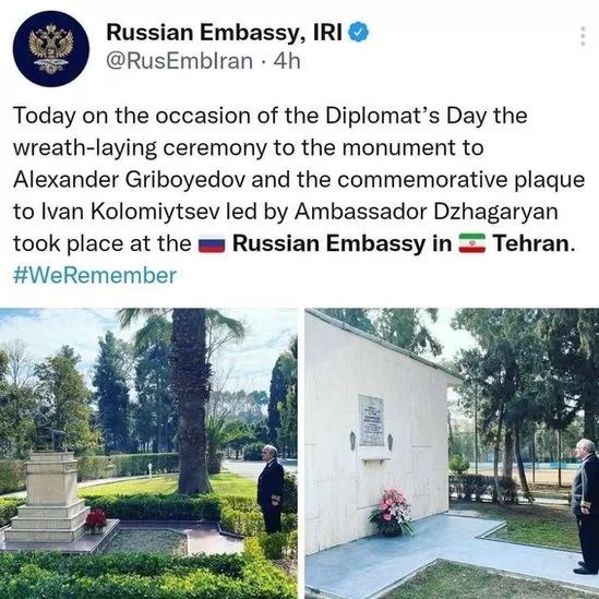 سفیر روسیه در تهران به تازگی در سالگرد قتل آقای گریبایدوف تصاویری از ادای احترام به وی را در توییتر منتشر کرده بود.