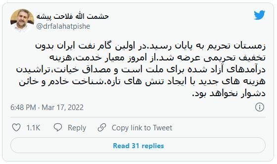 حشمتالله فلاحتپیشه، رئیس پیشین کمیسیون امنیت ملی و سیاست خارجی مجلس به تازگی در یک پیام توئیتری به اشاره، به احتمال موفقیت مذاکرات احیای برجام از پایان دوره "تخفیف تحریمی" خبر داد.