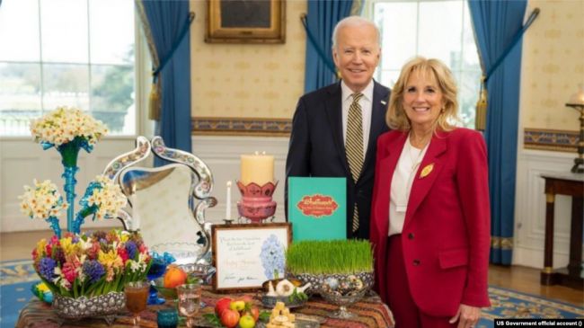 جو بایدن، رئیس جمهوری ایالات متحده، و جیل بایدن، بانوی نخست در کنار سفره هفتسین در کاخ سفید. ٢٩ اسفند ۱۴۰۰صدای آمریکا:جو بایدن، رئیس جمهوری ایالات متحده، و جیل بایدن، بانوی نخست، با انتشار پیامی فرارسیدن نوروز را شادباش گفتند.رئیس جمهوری و بانوی نخست آمریکا در این پیام ضمن تبریک فرارسیدن نوروز به همه کسانی که «در ایالات متحده و در سراسر جهان، از جمله در ایران» آن را جشن میگیرند، برپایی سفره هفتسین در کاخ سفید را بازتاب «روح سرآغازهای جدید و شادی نوروز» توصیف کردهاند.