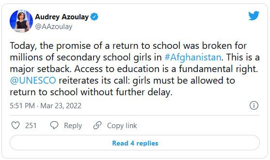 ادره آزوله تاکید کرد: «دسترسی به آموزش حق بنیادین است. یونسکو فراخوان خود را تکرار میکند : دختران باید اجازه پیدا کنند که بدون هیچ تاخیری به مدرسه بازگردند».این در حالی است که تا پیش از این و با تصمیم طالبان، تحصیل دختران در کلاسهای بالاتر از ششم ممنوع بود و دختران تا کلاس ششم، اجازه حضور در مدارس را داشتند.