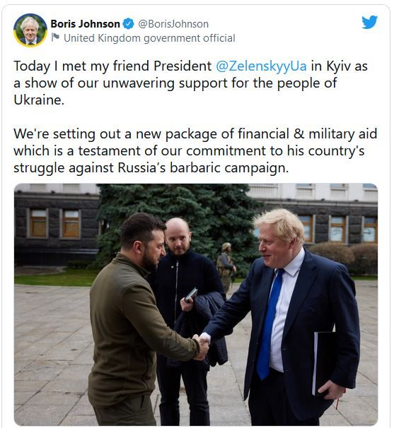 جانسون در توییتر نوشت: «امروز من با دوستم رئیس جمهور زلنسکی در کییف به نشانه حمایت بیدریغ از مردم اوکراین ملاقات کردم.»