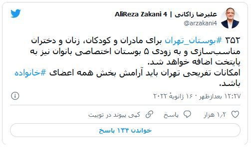 علیرضا زاکانی، شهردار تهران نیز پیشتر در توئیتی از آنچه «مناسبسازی» ۳۵۲ بوستان در تهران برای مادران، کودکان، زنان و دختران» نامیده خبر داده بود.