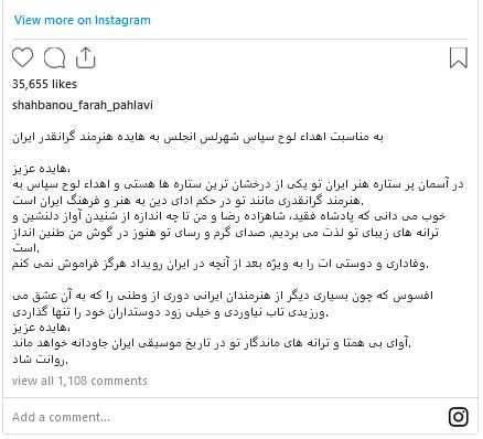 پیام شهبانو فرح پهلوی به مناسبت زادروز هایده