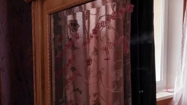 در یک گوشه، آینهای هست که روی آن با رژ لب نوشته شده: "در معرض شکنجه افراد ناشناس، دفن شده به دست سربازان روس."