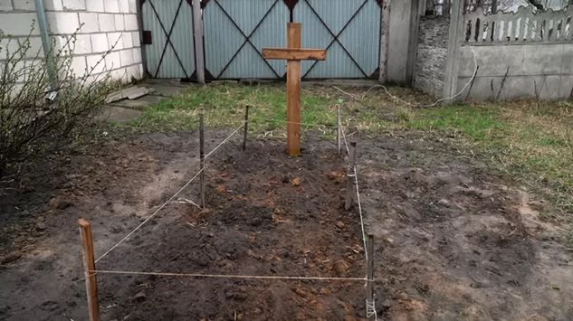 روی آینه نوشته شده: "در معرض شکنجه افراد ناشناس، دفن شده به دست سربازان روس"یک روز بعد از ملاقات ما، پلیس جسد این زن را برای بررسی نبش قبر کرد. جسد در حالت عریان با بریدگی عمیق و بلندی در گلو پیدا شد.آندری نبیتوف، رئیس پلیس منطقه کییف، به ما گفت که آنها در روستایی در ۵۰ کیلومتری غرب کییف، درباره پرونده دیگری تحقیق میکنند.