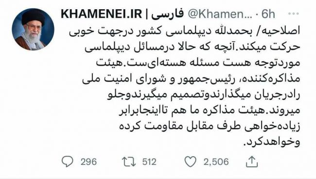 العربیه: توییتر علی خامنه‌ای، رهبر جمهوری اسلامی توییتی که در آن به نقل از او نوشته شده بود، «مذاکرات به خوبی پیش می‌رود» را حذف کرده و با انتشار «اصلاحیه‌ای» به جای آن نوشت: «دیپلماسی کشور درجهت خوبی حرکت میکند.»