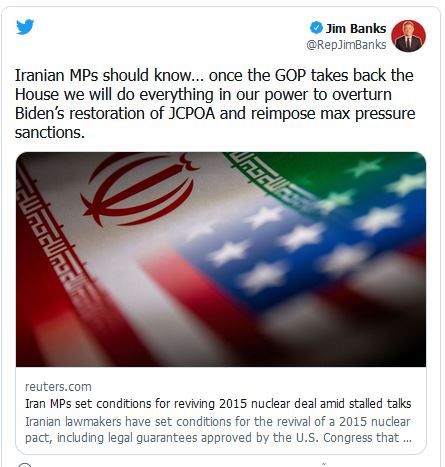 جیم بنکس نماینده ایندیانا در مجلس نمایندگان آمریکا هم امروز در توئیتی نوشته است: