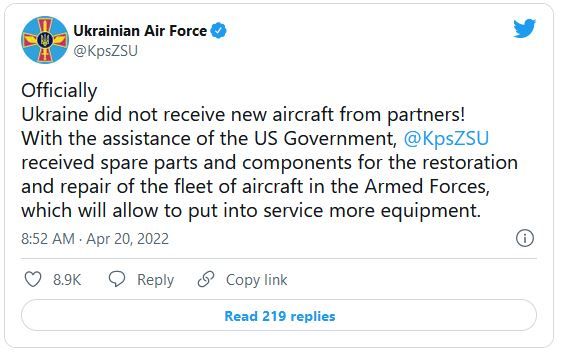 نیروی هوایی اوکراین هم تحویل هواپیماهای جنگی را تکذیب کرده اما توییت این نیرو در ۲۰ آوریل باعث سردرگمی بیشتر شد. آنها توضیح دادند که هیچ هواپیمایی از خارج دریافت نکردهاند بلکه فقط قطعات یدکی گرفتهاند.