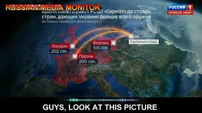 سپس نقشهای نشان داده شد که به نظر میرسید موشکها از کالینینگراد، جایی نزدیک لهستان، لیتوانی و دریای بالتیک به سوی اروپای غربی شلیک شده و قادرند در 106 ثانیه به برلین، 200 ثانیه به پاریس و 202 ثانیه به لندن برسند.