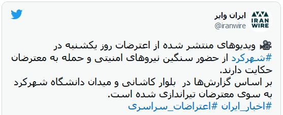 ویدیوی دیگری از اعترضات شهرکرد توسط صفحه توییتر ۱۵۰۰ تصویر منتشر شده که حضور سنگین نیروهای امنیتی و یورش آنها به سوی معترضان را نشان میدهد.