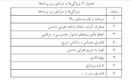 در این تحقیق، مهمترین قابلیت ریزپرندهها، «سرعت و قدرت مانور بالا»، «منحرف کردن سامانه پدافند هوایی» و «انجام ماموریتهای دشوار جاسوسی» اعلام شده است.