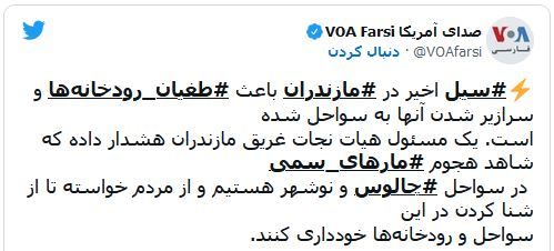 مار - آرشیوصدای آمریکا: گزارشها از ایران حاکی از این است که بر اثر سیل روزهای گذشته در مازندران و طغیان رودخانهها، مارهای سمی به ساحلهای برخی شهرها مثل چالوس و نوشهر هجوم بردهاند.خبرگزاریها در ایران روز دوشنبه ۱۷ مرداد گزارش دادند که «موجودات خزنده و خطرناک» در مناطق ساحلی «دوجمان، هچیرود، امامرود، رادیو دریا در چالوس، و پل ماشلک، سیترا و خیرود» دیده شدهاند.