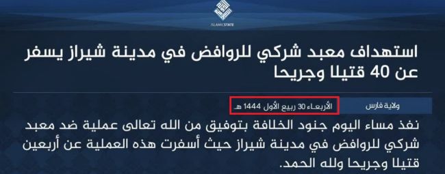 شامگاه ۰۴ آبان ۱۴۰۱ فردی مسلح وارد حرم شاهچراغ شد و در بدو ورود افرادی که مقابلش بودند را به گلوله بست. در فیلمی که از لحظه تیراندازی این فرد منتشر شده، معلوم است که او به صورت کور اقدام به تیراندازی کرده است و هرکس که دیده را به رگبار بسته است. مشخص نیست ضارب کیست و دلیل کارش چه بوده است، اما لحظاتی پیش تسنیم گزارش کرده که داعش مسئولیت این حمله تروریستی را برعهده گرفته است. البته متن پیامی که به نام داعش منتشر شده، یک ایراد در تاریخ وقوع حادثه داشت. سعید شریعتی در توضیح این خطا چنین نوشت: «چهارشنبه در سرزمینهای عربی ۱ ربیعالثانی و در تقویم ایران ۲۹ ربیعالاول است. اساسا ربیعالاول ۲۹ روزه است.»