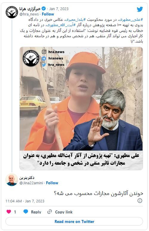 اعتراض علی مطهریعلی مطهری، فرزند مرتضی مطهری از تئوریسینهای انقلاب اسلامی، در کانال تلگرامی خود به یکی از جرایمی که دادگاه برای یلدا معیری تعیین کرده اعتراض کرد.