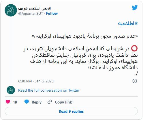جلوگیری از مراسم یادبود در دانشگاه شریفانجمن اسلامی دانشجویان دانشگاه شریف از عدم دریافت مجوز برگزاری مراسم یادبود قربانیان هواپیمای اوکراینی که سه سال پیش توسط سپاه پاسداران سرنگون شد، خبر داد.