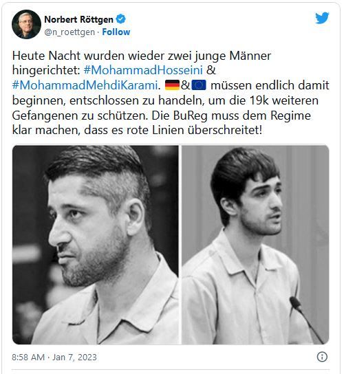 نوربرت روتگن، از سیاستمداران بانفوذ وابسته به حزب دموکرات مسیحی آلمان در پیامی توئتیری نوشت، دولت آلمان "باید به رژیم (ایران) بهوضوح نشان دهد که در حال گذار از خط قرمز است".