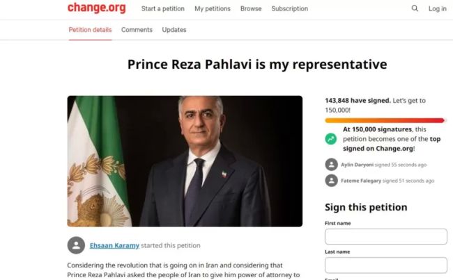 طومار آنلاین اعطای وکالت/نمایندگی به شاهزاده رضا پهلوی که احسان کرمی دیروز ایجاد کرده است تا زمان تنظیم این گزارش توانسته بیش از ۱۴۰ هزار امضا را پای خود ثبت کند.