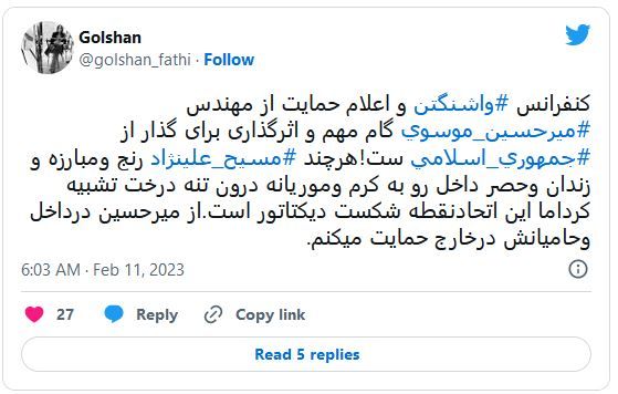 یکی از کاربران توییتر در نظری نوشت: «کنفرانس واشنگتن و اعلام حمایت از مهندس میرحسین موسوی گام مهم و اثرگذاری برای گذار از جمهوری اسلامی است! هرچند مسیح علینژاد رنج و مبارزه و زندان و حصر داخل رو به کرم و موریانه درون تنه درخت تشبیه کرد اما این اتحاد نقطه شکست دیکتاتور است. از میرحسین در داخل وحامیانش در خارج حمایت میکنم.»