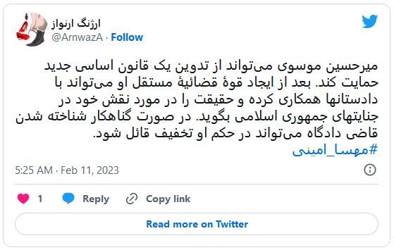 کاربرد دیگر با نام ارژنگ ارنواز گفت: «میرحسین موسوی میتواند از تدوین یک قانون اساسی جدید حمایت کند. بعد از ایجاد قوه قضائیه مستقل او میتواند با دادستانها همکاری کرده و حقیقت را در مورد نقش خود در جنایتهای جمهوری اسلامی بگوید. در صورت گناهکار شناخته شدن قاضی دادگاه میتواند در حکم او تخفیف قائل شود.»