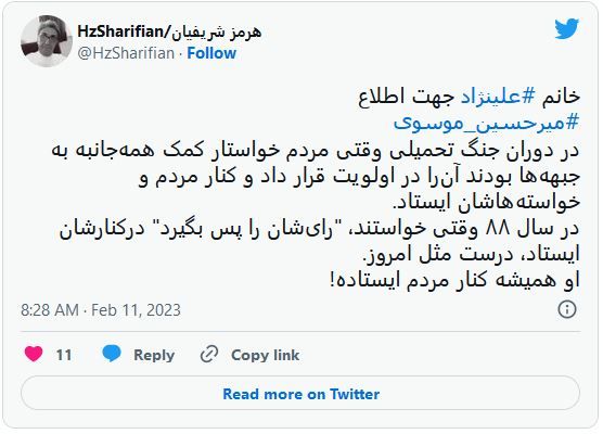 از سوی دیگر هرمز شریفیان روزنامهنگار در نقدی به سخنان علینژاد گفت: «خانم علینژاد جهت اطلاع میرحسین موسوی در دوران جنگ تحمیلی وقتی مردم خواستار کمک همهجانبه به جبههها بودند آنرا در اولویت قرار داد و کنار مردم و خواستههاشان ایستاد. در سال ۸۸ وقتی خواستند، "رایشان را پس بگیرد" درکنارشان ایستاد، درست مثل امروز. او همیشه کنار مردم ایستاده!»