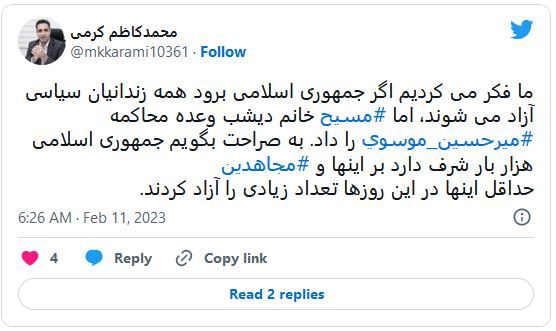 محمد کاظم کرمی، فعال سیاسی اصلاحطلب نیز در نظری اعلام کرد: «ما فکر می کردیم اگر جمهوری اسلامی برود همه زندانیان سیاسی آزاد می شوند، اما مسیح خانم دیشب وعده محاکمه میرحسین موسوی را داد. به صراحت بگویم جمهوری اسلامی هزار بار شرف دارد بر اینها و مجاهدین. حداقل اینها در این روزها تعداد زیادی را آزاد کردند.»