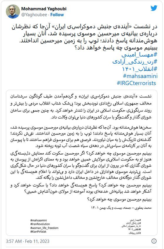 عکسی از نشست روز گذشته چهرههای مخالف جمهوری اسلامی در واشنگتن به همراه عکسی از موسوی و زهرا رهنورد در حصر خانگی یورونیوز: نظر چهرههای مخالف جمهوری اسلامی در خارج از ایران درباره بیانیه اخیر میرحسین موسوی، نامزد معترض انتخابات سال ۱۳۸۸ واکنشهای متفاوتی را ایجاد کرد.رضا پهلوی، ولیعهد سابق ایران، مسیح علینژاد، کنشگر حوزه زنان و حامد اسماعیلیون، سخنگوی خانوادههای هواپیمای ۷۵۲ سه نفری بودند که در نشست روز گذشته دانشگاه جورج تاون واشنگتن با عنوان «آینده جنبش دموکراسی ایران» درباره بیانیه اخیر میرحسین موسوی نظرات خود را مطرح کردند.