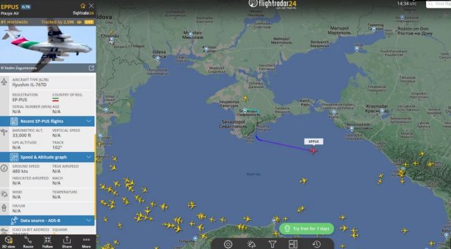نقشه ترافیک هوایی منطقه و حرکت هواپیمای ایلوشین ۷۶ که رسانههای اوکراینی منتشر کردهاند رادیو فردا: وزارت خارجه آمریکا روز جمعه با اشاره به تلاش حکومت ایران برای سرپوش گذاشتن بر همکاری نظامی با روسیه، در حساب کاربری فارسی خود در شبکه «ایکس»٬ توئیتر سابق٬ تاکید کرده است که به رغم انکار تهران٬ شواهد «روشنی»از پرواز یک هواپیمای شرکت هواپیمایی وابسته به سپاه به «بخش اشغالی» کریمه وجود دارد.