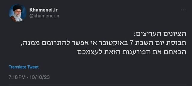 ترجمه: «ای ستمگران صهیونیست! شکست شنبه ۱۵ مهر، غیر قابل ترمیم است. خودتان این بلا را بر سر خود آوردید.»