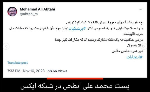 محمد علی ابطحی، معاون پارلمانی محمد خاتمی رییس جمهور اسبق ایران هم در ایکس نوشته است: «با رد صلاحیت خیلیها و به خصوص دکتر پزشکیان دیدید حرف آن خانم درست بود که مملکت مال حزباللهیهاست...دورهمی، خالص خالص.»اشاره او به نظر جنجال برانگیز یکی از کارشناسان صدا و سیما است که چند روز پیش خبرساز شد.