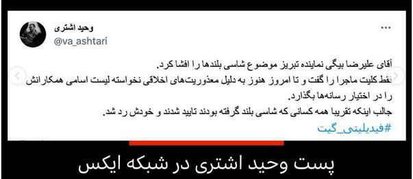 وحید اشتری، فعال رسانهای هم به رد صلاحیت شدن علیرضا بیگی، افشاکننده «پرونده واگذاری خودروهای شاسی بلند به نمایندگان» نوشته است: «آقای علیرضا بیگی نماینده تبریز موضوع شاسی بلندها را افشا کرد... جالب اینکه تقریبا همه کسانی که شاسی بلند گرفته بودند تایید شدند و خودش رد شد.»