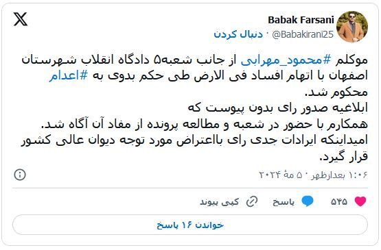 بابک فارسانی، وکیل دادگستری، روز یکشنبه ۱۶ اردیبهشت در شبکه اجتماعی ایکس نوشت: «موکلم محمود مهرابی از جانب شعبه ۵ دادگاه انقلاب شهرستان اصفهان با اتهام افساد فیالأرض طی حکم بدوی به اعدام محکوم شد.»