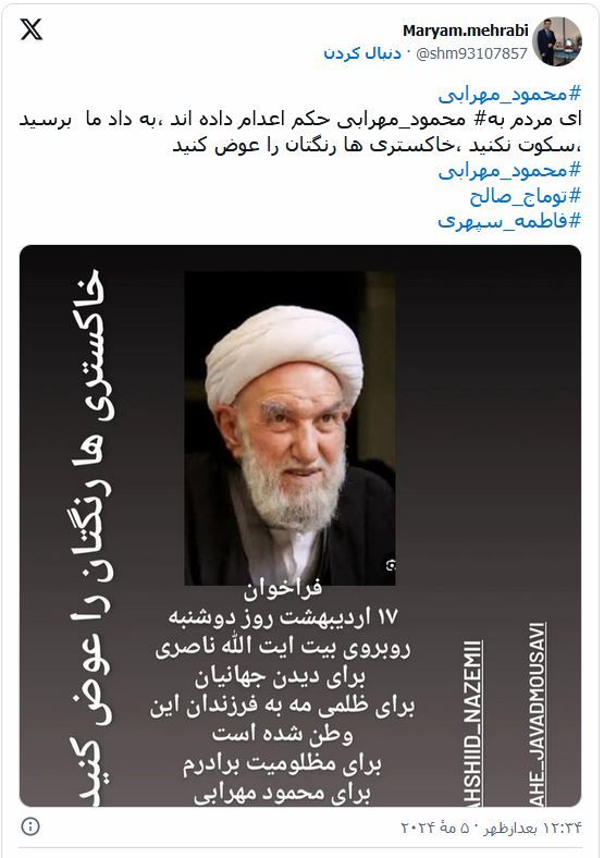 از سوی دیگر، حساب منتسب به مریم مهرابی، دیگر خواهر محمود مهرابی، در شبکههای اجتماعی ایکس و اینستاگرام مطلبی منتشر کرده که بر اساس آن او قصد دارد در اعتراض به صدور حکم اعدام برای برادرش، روز دوشنبه در مقابل خانه آیتالله محمدعلی ناصری، از استادان حوزه علمیه در اصفهان، «خودسوزی» کند.