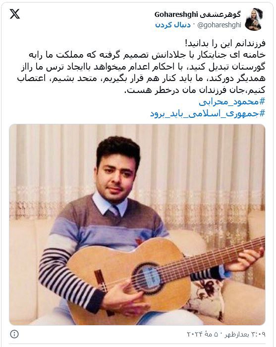 گوهر عشقی، مادر دادخواه ستار بهشتی، کارگر وبلاگنویسی که در بازداشت کشته شد، در واکنش به صدور حکم اعدام برای محمود مهرابی در ایکس نوشت: «خامنهای جنایتکار با جلادانش تصمیم گرفته که مملکت ما را به گورستان تبدیل کند، با احکام اعدام میخواهد با ایجاد ترس ما را از همدیگر دور کند، ما باید کنار هم قرار بگیریم، متحد بشویم، اعتصاب کنیم، جان فرزندانمان درخطر است.»دادگاه انقلاب اصفهان محمود مهرابی را به اعدام محکوم کرد