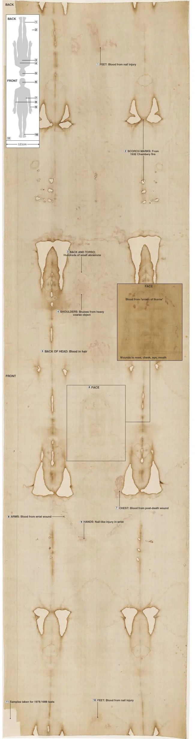 در این تصویر، نشانهای اصلی روی پارچه مشخص شده که به گفته اسقفنشین تورین، مسئول نگهداری آن، شواهدی است که نشان میدهد با این پارچه بدن مردی را پوشاندهاند که «روی صلیب جان داده است»