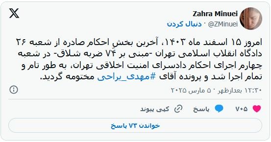 آن‌طور که زهرا مینویی در شبکه ایکس اطلاع‌رسانی کرده، این حکم روز چهارشنبه، ۱۵ اسفند ۱۴۰۳ اجرا شده است.