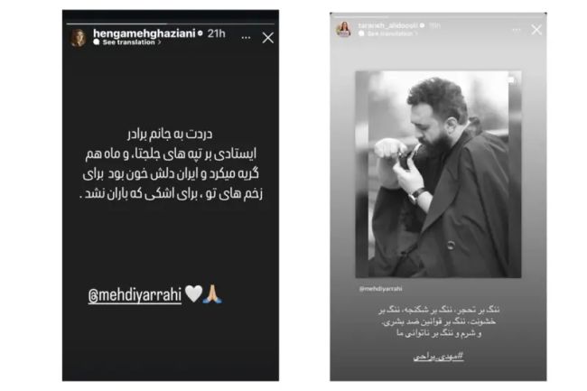 ترانه علیدوستی، بازیگرسینمای ایران که او نیز در پی حمایت از معترضان جنبش «زن، زندگی، آزادی» زندانی و ممنوعالکار شده است، در استوری در اینستاگرام نوشت: «ننگ بر تحجر، ننگ بر شکنجه، ننگ بر خشونت، ننگ بر قوانین ضد بشری و شرم و ننگ برناتوانی ما»