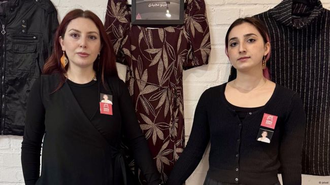 رویا (راست) و مهسا پیرایی در نمایشگاه "آنچه باقی ماند"مهسا پیرایی میگوید: «یکی از افتخارات من در زندگی نمایشگاه آنچه باقی ماند و همکاری با انجمن دادخواهان ایران است.»