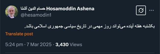 عبدی مدیا: حجت الاسلام والمسلمین آقای آشنا معاون اسبق وزارت اطلاعات و مشاور سابق رییس جمهور و استاد دانشگاه امام صادق با در نظر گرفتن همه شرایط که برای عبدی مدیا قابل درک است توییت خود را پاک کرد باید دید جناب آشنا توییت ویرایش و غیر مستقیم دیگری منتشر خواهد کرد یا در مهم ترین، مهم ترین مقطع تاریخ طلاعاتی سیاسی جمهوری اسلامی سکوت خواهد کرد؟۳۹