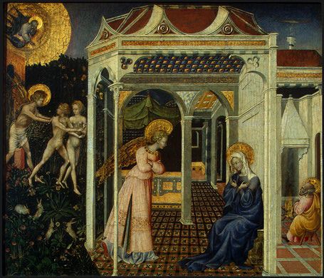 در نقاشی «بشارت و اخراج از بهشت» (حدود ۱۴۳۵) جووانی دی پائولو، دو زن نمادین مسیحیت را به تصویر کشیده است: مریم مقدس که خبر مادر شدنش را دریافت میکند و حوا که از باغ عدن رانده میشودرودن میگوید: «در حالی که معمولا حوا را به عنوان نماد زن گناهکار و مریم را به عنوان نماد زن مقدس معرفی میکنند، گبارا تفسیری نو ارائه میدهد که این دو ارزیابی را به چالش میکشد.او اضافه میکند: «حوا نمادی از احیای قدرت زنانه است.»