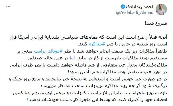 احمد زیدآبادی، روزنامهنگار و فعال سیاسی به طنز نوشت احتمالا فاصله صندلیها را انقدر زیاد میکنند که مذاکره غیرمستقیم شود.