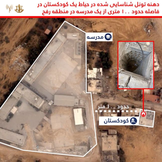 ارتش اسرائیل با نشر این ویدیوی می گوید یک تونل متعلق به «حماس» را در حیاط یک مهد کودک تخریب شده در شهر رفح در جنوب نوار غزه شناسایی کرده است.سازمان تروریستی حماس به طور سیستماتیک قوانین بینالمللی را نقض میکند و بهطور فریبنده از مؤسسات غیرنظامی و جمعیت به عنوان سپر انسانی برای فعالیتهای تروریستی سوءاستفاده میکند. pic.twitter.com/ck8N8CHN1Y