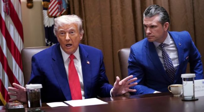 پیت هگست، وزیر دفاع آمریکا، در کنار دونالد ترامپ در جلسه کابینه، ۱۰ آوریل رادیو فردا: وزیر دفاع آمریکا میگوید دونالد ترامپ در جلوگیری از دستیابی ایران به سلاح هستهای «کاملاً جدی» است، بهویژه از طریق دیپلماسی؛ اما در صورت شکست مذاکرات، ایران با گزینههای نظامی روبهرو خواهد شد.