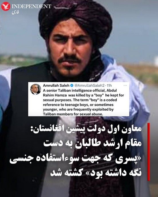 ایندیپندنت فارسی: امرالله صالح، معاون اول دولت پیشین افغانستان روز دوشنبه، ۲۵ فروردینماه با انتشار پیامی در اکس از کشته شدن یکی از مقامهای ارشد اطلاعاتی طالبان «به دست پسری که جهت سوءاستفاده جنسی نگه داشته بود» خبر داد.صالح نوشت: عبدالرحیم حمزه، مقام ارشد اطلاعاتی طالبان به دست «پسری» که او را برای سوءاستفاده جنسی نگه داشته بود، کشته شد. واژه «پسر» در اینجا بهطور رمزی به نوجوانان یا گاهی کودکان کمسنوسالی اشاره دارد که اعضای طالبان آنها را برای سوءاستفاده جنسی مورد بهرهکشی قرار میدهند. ظاهرا این پسر از وضعیت خسته شده و دست به اقدام زده است.
