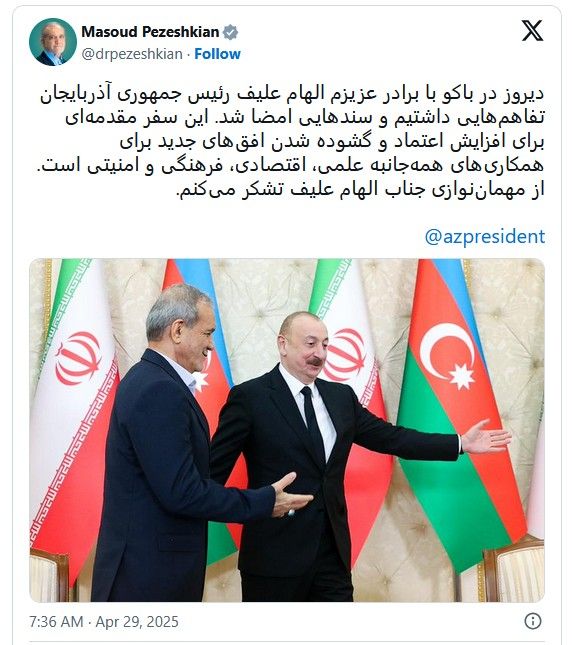 مسعود پزشکیان، رئیس جمهوری ایران، پس از سفر رسمی به باکو از الهام علیاف، رئیس جمهوری آذربایجان قدردانی کرد. آقای پزشکیان در پیامی در شبکه اجتماعی ایکس نوشت: «دیروز در باکو با برادر عزیزم الهام علیاف رئیس جمهوری آذربایجان تفاهمهایی داشتیم و سندهایی امضا شد. این سفر مقدمهای برای افزایش اعتماد و گشوده شدن افقهای جدید برای همکاریهای همهجانبه علمی، اقتصادی، فرهنگی و امنیتی است.»