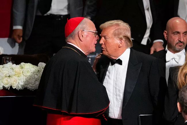 دونالد ترامپ و تیموتی دولان، اسقف اعظم نیویورک، در مراسم سالانه بنیاد یادبود آلفرد ای. اسمیتروند انتخاب پاپ جدید