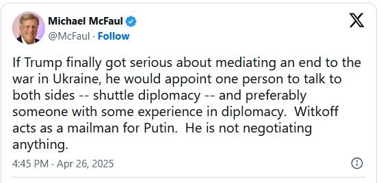 مایکل مکفاول، سفیر سابق آمریکا در روسیه با انتقاد از رویکرد آقای ویتکاف در توافق با اوکراین در شبکه اجتماعی ایکس نوشت: «او نقش پیامرسان پوتین را ایفا میکند، درحال مذاکره نیست.»