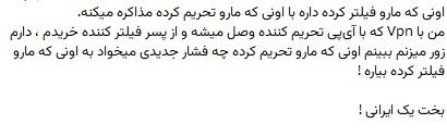 من با Vpn که به آیپی تحریم کننده وصل میشه و از پسر فیلتر کننده خریدم ، دارم زور میزنم ببینم اونی که مارو تحریم کرده چه فشار جدیدی میخواد به اونی که مارو فیلتر کرده بیاره !