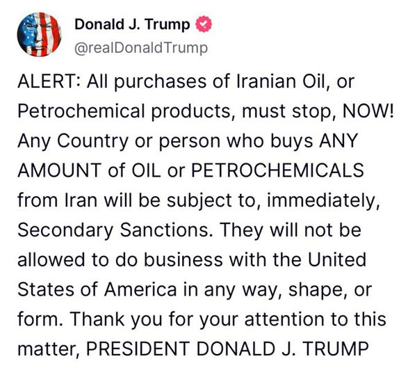 ترامپ با انتشار پستی در «سوشال تروث» نوشت: «تمام خریداران نفت یا محصولات پتروشیمی ایران باید این کار را متوقف کنند. هر کشور یا فردی که به هر میزان نفت یا پتروشیمی از ایران خریداری کند، بلافاصله مشمول تحریم‌های ثانویه خواهد شد. آن‌ها به هیچ‌وجه و تحت هیچ شرایطی اجازه نخواهند داشت با ایالات متحده آمریکا تجارت کنند.»