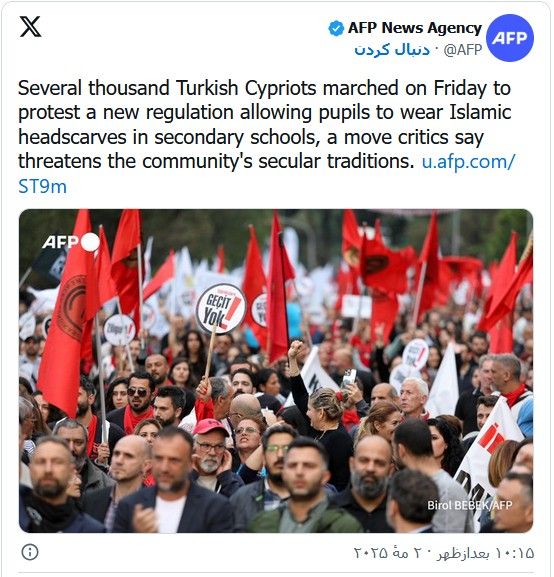 رجب طیب اردوغان، رئیسجمهور ترکیه، در قبرس شمالی. شنبه ۱۳ اردیبهشترادیو فردا: رجب طیب اردوغان، رئیسجمهور ترکیه، در جریان سفر کوتاه خود به قبرس شمالی که تنها از سوی آنکارا به رسمیت شناخته میشود، معترضان به قانون جدید اجازه استفاده از حجاب در مدارس را به تلاش برای «ایجاد نفرت و تفرقه» متهم کرد.رجب طیب اردوغان روز شنبه ۱۳ اردیبهشت در واکنش به موج فزاینده اعتراضها در قبرس شمالی نسبت به قانون جنجالی حجاب در مدارس، هشدار داد که «بذر نفرت و تفرقه» میان تُرکها و ترکهای قبرس کاشته نشود. این اظهارات در جریان سفر یکروزه اردوغان به منطقه تحت اشغال ترکیه در شمال قبرس مطرح شد؛ جایی که هزاران شهروند تُرکتبار قبرسی روز جمعه در اعتراض به این قانون به خیابانها آمدند.